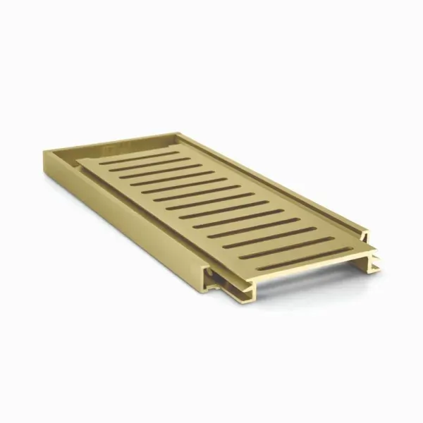14mm x 100mm x 5600mm Ezy Flow heel guard grate in brushed gold is suitable for indoor and outdoor use. Ideal for bathrooms, around swimming pools, balconies and driveways.