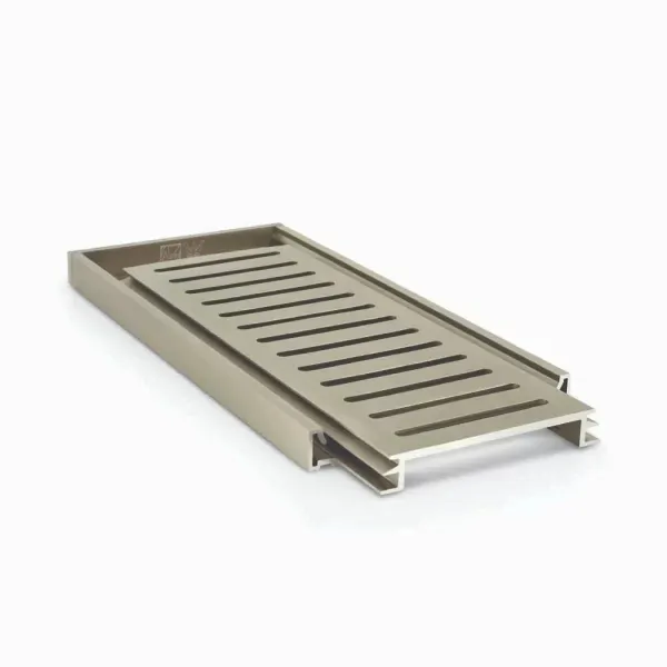 14mm x 100mm x 5600mm Ezy Flow heel guard grate in brushed nickel is suitable for indoor and outdoor use. Ideal for bathrooms, around swimming pools, balconies and driveways.