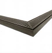 26mm x 100mm x 5600mm Ezy Flow heel guard grate - 45 degree corner - in brushed gun metal is suitable for indoor and outdoor use. Ideal for bathrooms, around swimming pools, balconies and driveways.