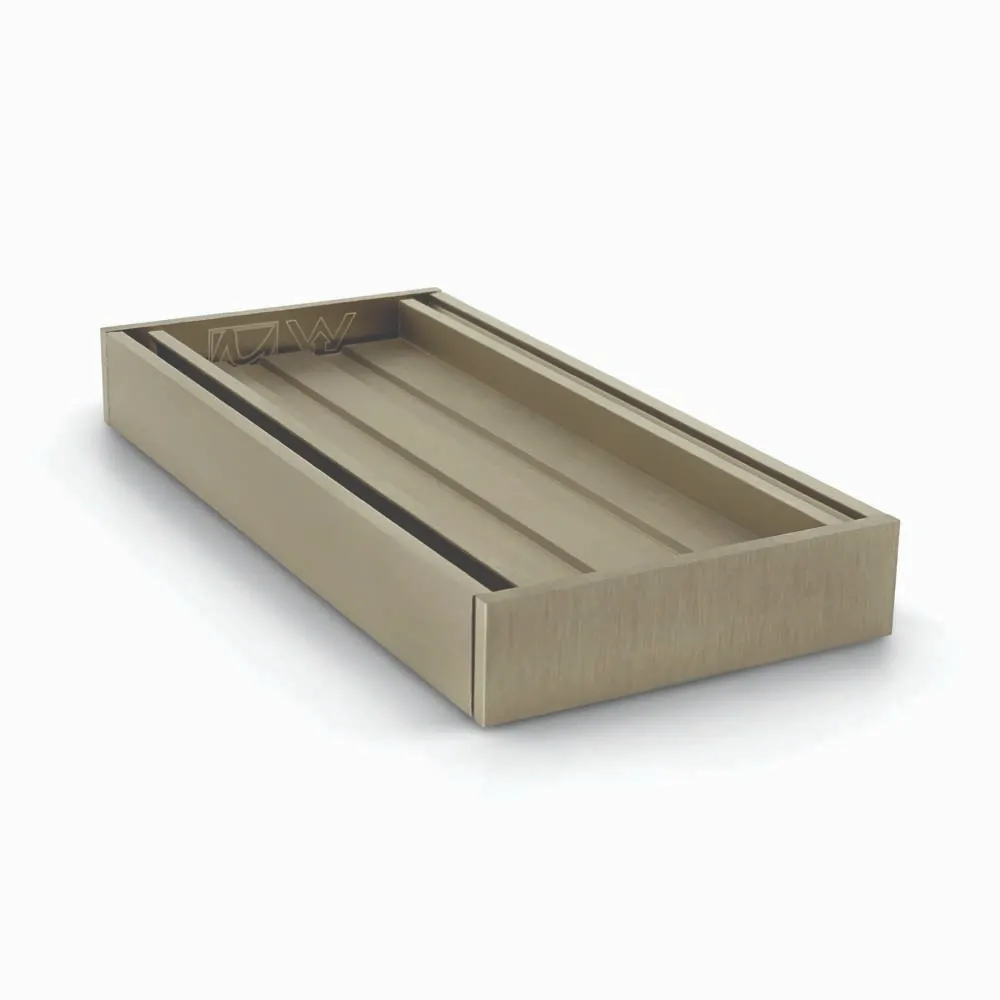 26mm x 100mm x 5600mm Ezy Flow tile inset grate in brushed nickel is suitable for indoor and outdoor use. Ideal for bathrooms, around swimming pools, balconies and driveways.