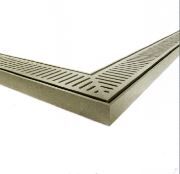 35mm x 100mm x 5600mm Ezy Flow heel guard grate - 45 Degree Corner - in brushed nickel is suitable for indoor and outdoor use. Ideal for bathrooms, around swimming pools, balconies and driveways.