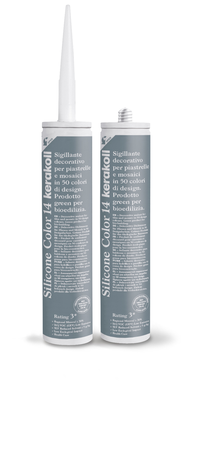 Decorative sealant for tiles and mosaic in 39 design colours. Green product for bio-building. Silicone Color develops a high degree of adhesion to non-absorbent surfaces, guaranteeing the integrity and watertightness of ceramic and porcelain coverings subject to deformation.