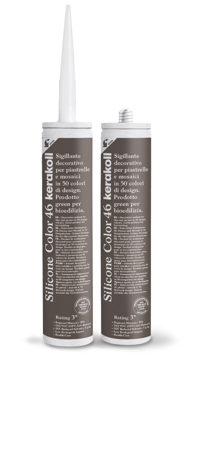 Decorative sealant for tiles and mosaic in 39 design colours. Green product for bio-building. Silicone Color develops a high degree of adhesion to non-absorbent surfaces, guaranteeing the integrity and watertightness of ceramic and porcelain coverings subject to deformation.