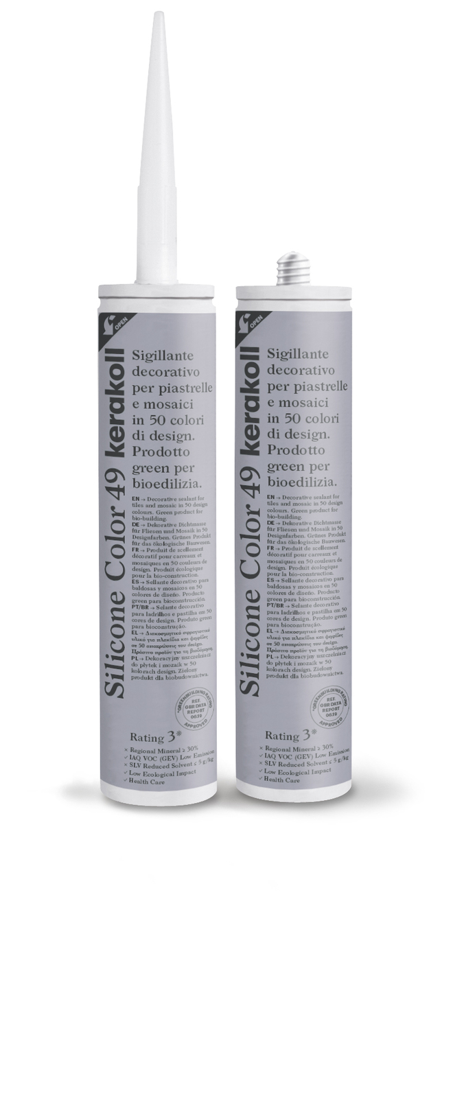 Decorative sealant for tiles and mosaic in 39 design colours. Green product for bio-building. Silicone Color develops a high degree of adhesion to non-absorbent surfaces, guaranteeing the integrity and watertightness of ceramic and porcelain coverings subject to deformation.