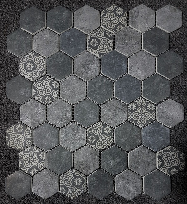Mix of Stone look, Concrete look and patterned hexagonal glass tiles to give a soft elegant romantic look. Satin/Matt finish Glass Tile 45 x 52 mm size tile - Sheet size 300x300mm also available in White - Concrete - Smoke colours A great tile to provide contrast in size, shape and texture in all bathrooms and kitchens. Complements white, dark, marble, travertine and concrete tiles.