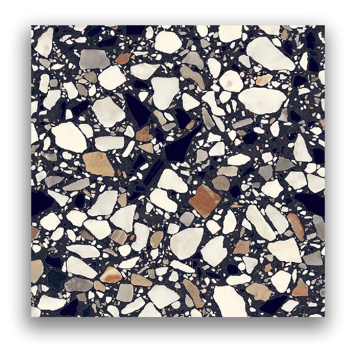 Fragment Macro Nero Matt 200x200mm. Fragments of marble, earthenware and glass brought together in the same ceramic material.