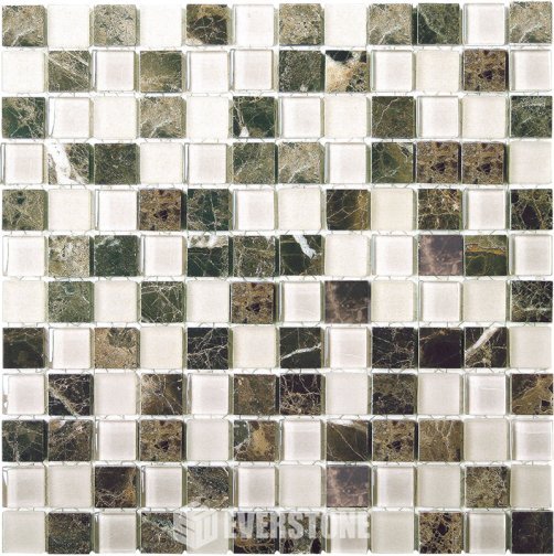 This feature mosaic sheet is a dramatic blend of the well known natural  stone called Emperador, with a combination of oak coloured frosted and clear finish colour-backed glass.