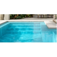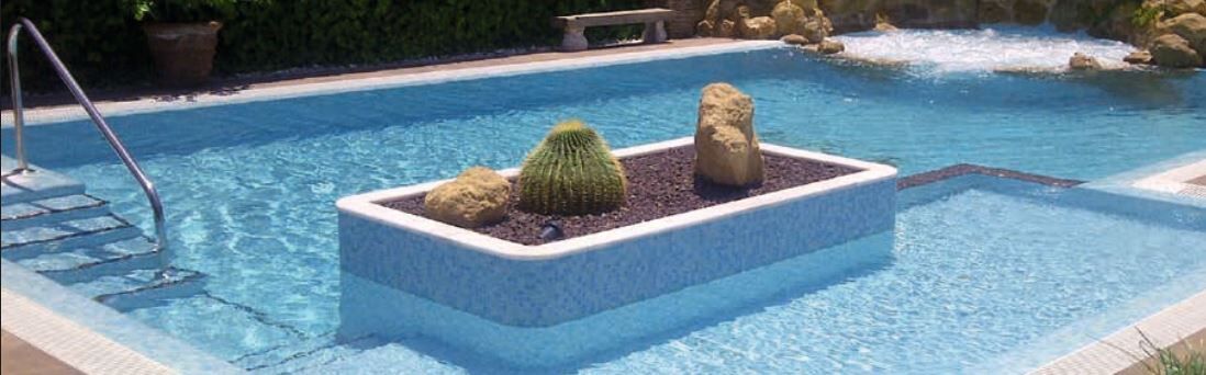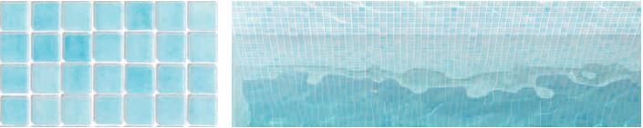 Fog Azul Celeste pale blue glass mosaic. Perfect for use in swimming pools but can also be used in Bathrooms or for kitchen splashbacks. The translucent properties provide a special brightness and luminosity in contact with the water of the pool.