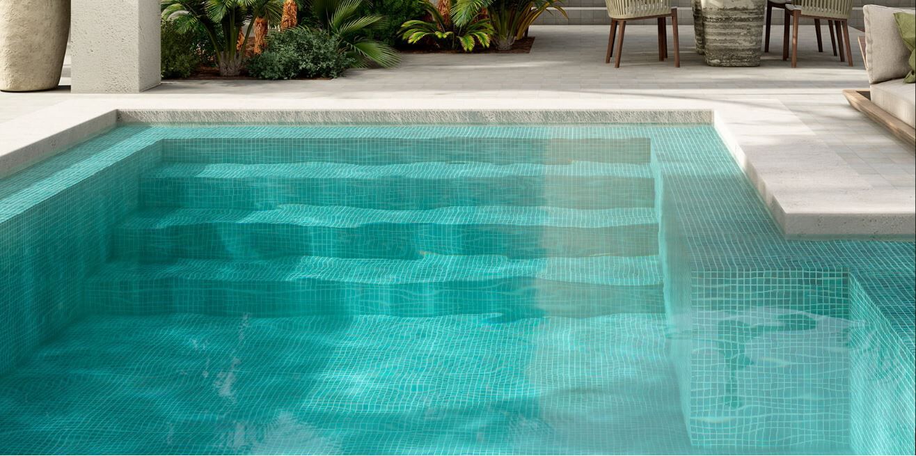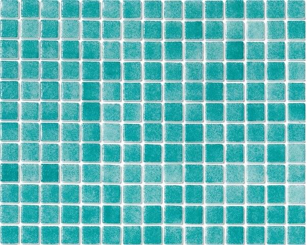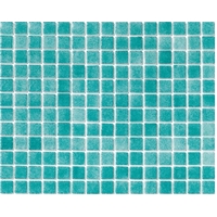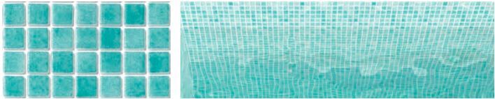 Fog Turquoise glass mosaic. Perfect for use in swimming pools but can also be used in Bathrooms or for kitchen splashbacks. The translucent properties provide a special brightness and luminosity in contact with the water of the pool.