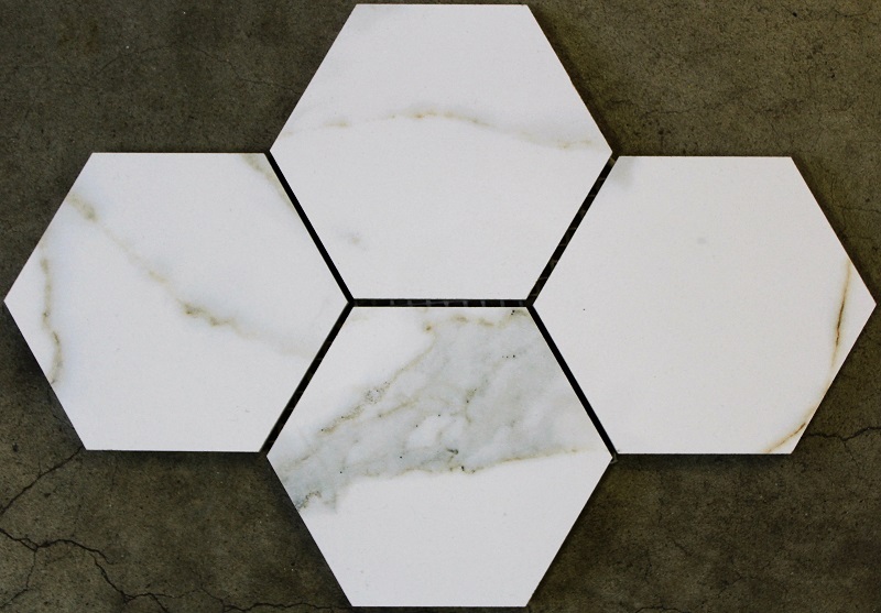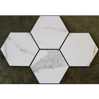 Hexagon Tile - Porcelain. Calcutta Gold Glazed tiles that come in both Polished and Honed finishes This tile has subtle undulations on the surface of the tile where the darkest veins run for a feel of genuine marble . Size 150mm x 130mm