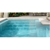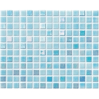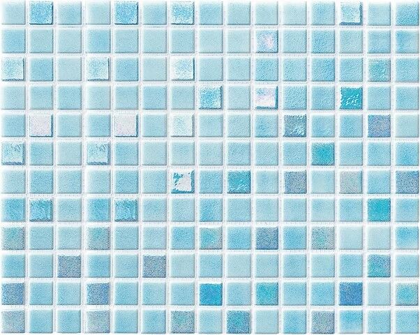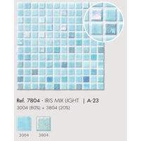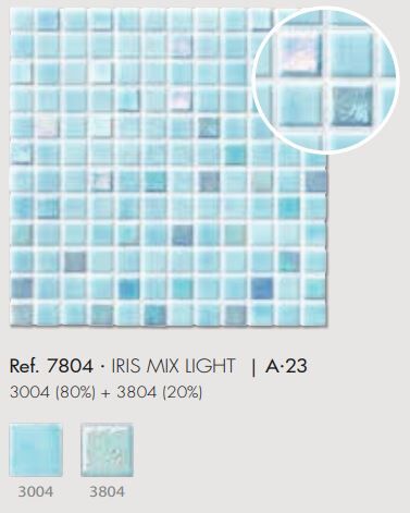 Iris Mix Light Blue glass mosaic. Perfect for use in swimming pools but can also be used in Bathrooms or for kitchen splashbacks. The translucent properties provide a special brightness and luminosity in contact with the water of the pool.