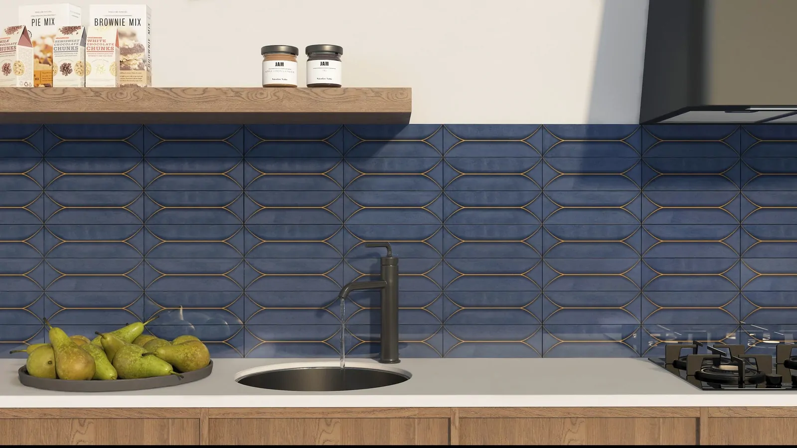 Negassi Navy creates instant impact with its deep colour and elegant geometric pattern. Perfect for kitchen splashbacks or statement walls, it pairs beautifully with warm timber cabinetry, stone benchtops and matte black or brass fixtures.