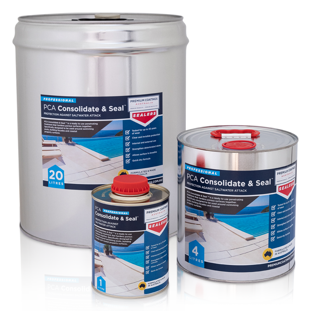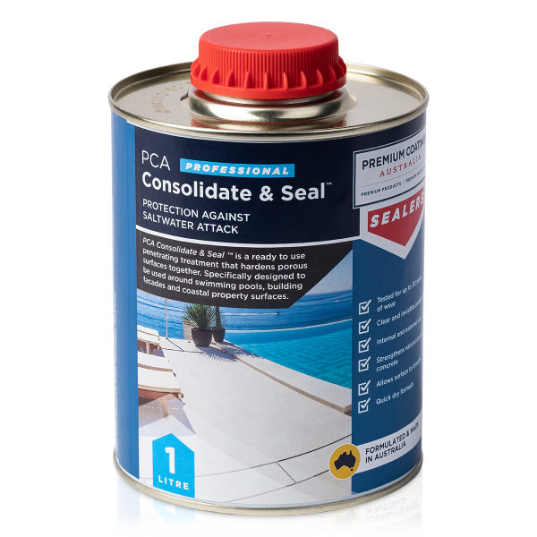PCA Consolidate & Seal™ is a ready to use penetrating treatment that hardens porous & granular surfaces together. Specifically designed to be used around swimming pools, building façades and coastal property surfaces.