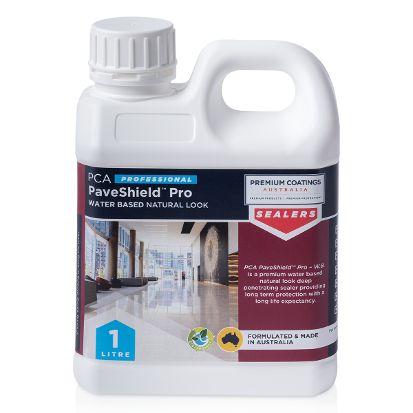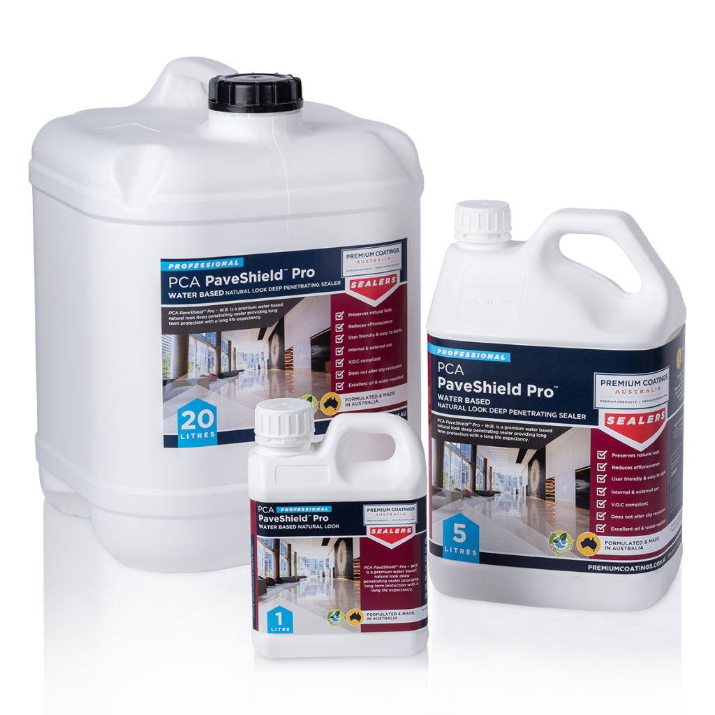 PCA PaveShield™ Pro – W.B. is a premium grade water based natural look penetrating sealer providing long term protection with a long life expectancy. PREMIUM COATINGS AUSTRALIA (PCA) has specifically developed this product for the tiling and paving industry to treat natural stone and is also suitable for a variety of other surfaces. It is invisible upon application and will not alter the appearance or the slip resistance of the treated surface. PCA PaveShield™ Pro – W.B. allows the treated surface to breathe.