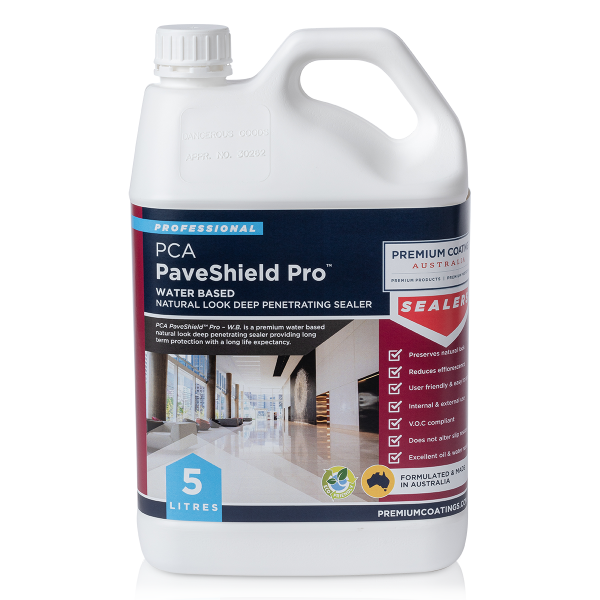 PCA PaveShield™ Pro – W.B. is a premium grade water based natural look penetrating sealer providing long term protection with a long life expectancy. PREMIUM COATINGS AUSTRALIA (PCA) has specifically developed this product for the tiling and paving industry to treat natural stone and is also suitable for a variety of other surfaces. It is invisible upon application and will not alter the appearance or the slip resistance of the treated surface. PCA PaveShield™ Pro – W.B. allows the treated surface to breathe.