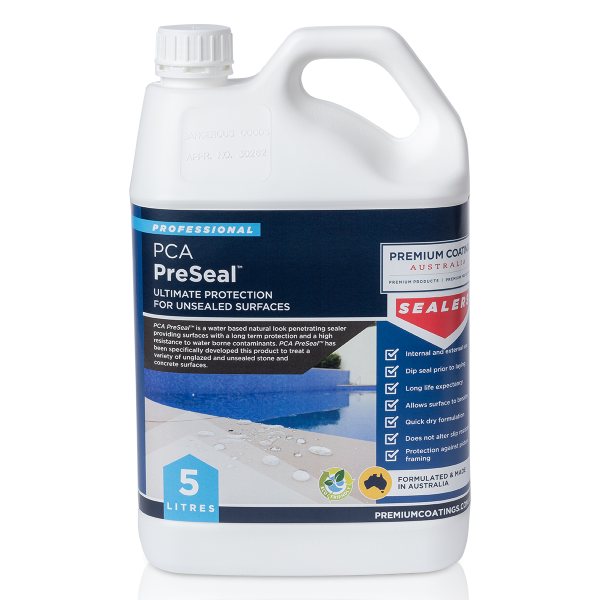 PCA PreSeal™ is a water based natural look penetrating sealer providing surfaces with a long term protection and a high resistance to water borne contaminants. Premium Coatings Australia (PCA) has specifically developed this product to treat a variety of unglazed and unsealed stone and concrete surfaces. It is ideal for internal or external use and an excellent protection against picture framing.