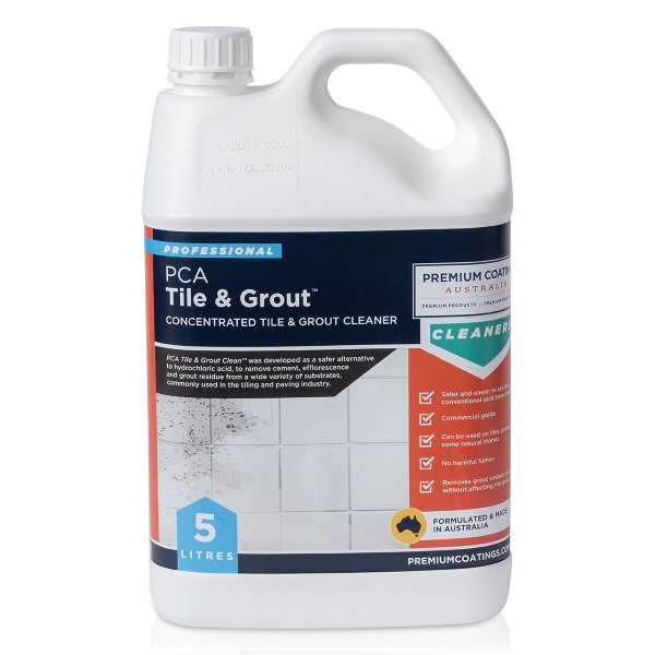 PCA Tile & Grout Clean™ (T.G.C) is a concentrated tile cleaner, this cleaner was developed to remove cement and grout residue, efflorescence and is a safer alternative to hydrochloric acid. Premium Coatings Australia (PCA) has developed this product to treat a wide variety of substrates commonly used in the tiling and paving industry.