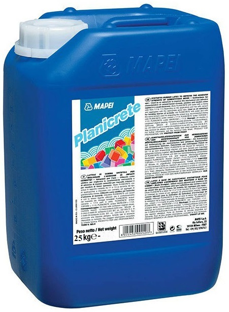 Planicrete is a latex based on synthetic polymers, which cannot be re-emulsified in water after hardening and are also resistant to saponification.