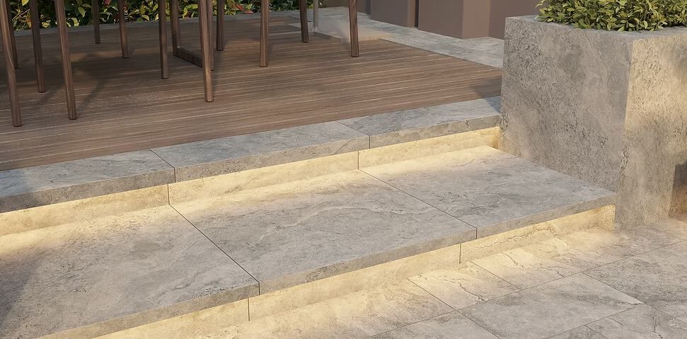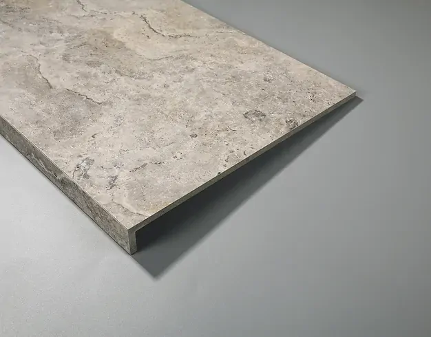 Travertino Sterling Drop Edge Tech Grip surface is incredibly smooth to touch, but is also able to achieve a P5 rating when wet, this allows it to be used internally and externally creating a seamless look. Also in Bianco, Ice and Pearl colours.