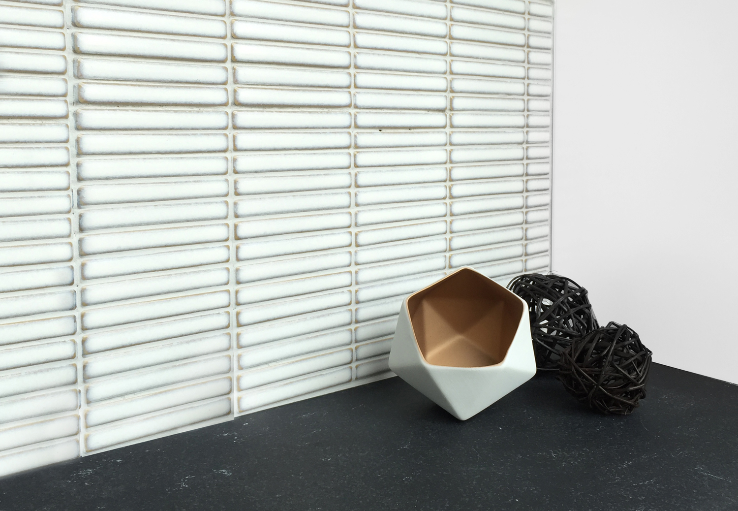 Zest White Gloss Kit Kat Tile 12x92mm Porcelain Mosaic Wall Tile. Stack bond format with a subtle antique edge glaze. Ideal for bathrooms Kitchens and feature walls.